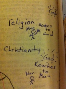Christianity is radically different from any other religion or worldview out there. There are people who claim that all religions are virtually the same and that you can just mix Christianity with anything and “it’s all good.” But this is just not true. I was told in a Bible study one time as a 13 or 14 year old that with religion man reaches to God, but with Christianity God reaches to man. It was as simple as that. In fact, I went down into my basement, opened a box of old books and found my “NIV Study Bible for Kids” and found the picture I drew in my Bible from that very Bible study night:
